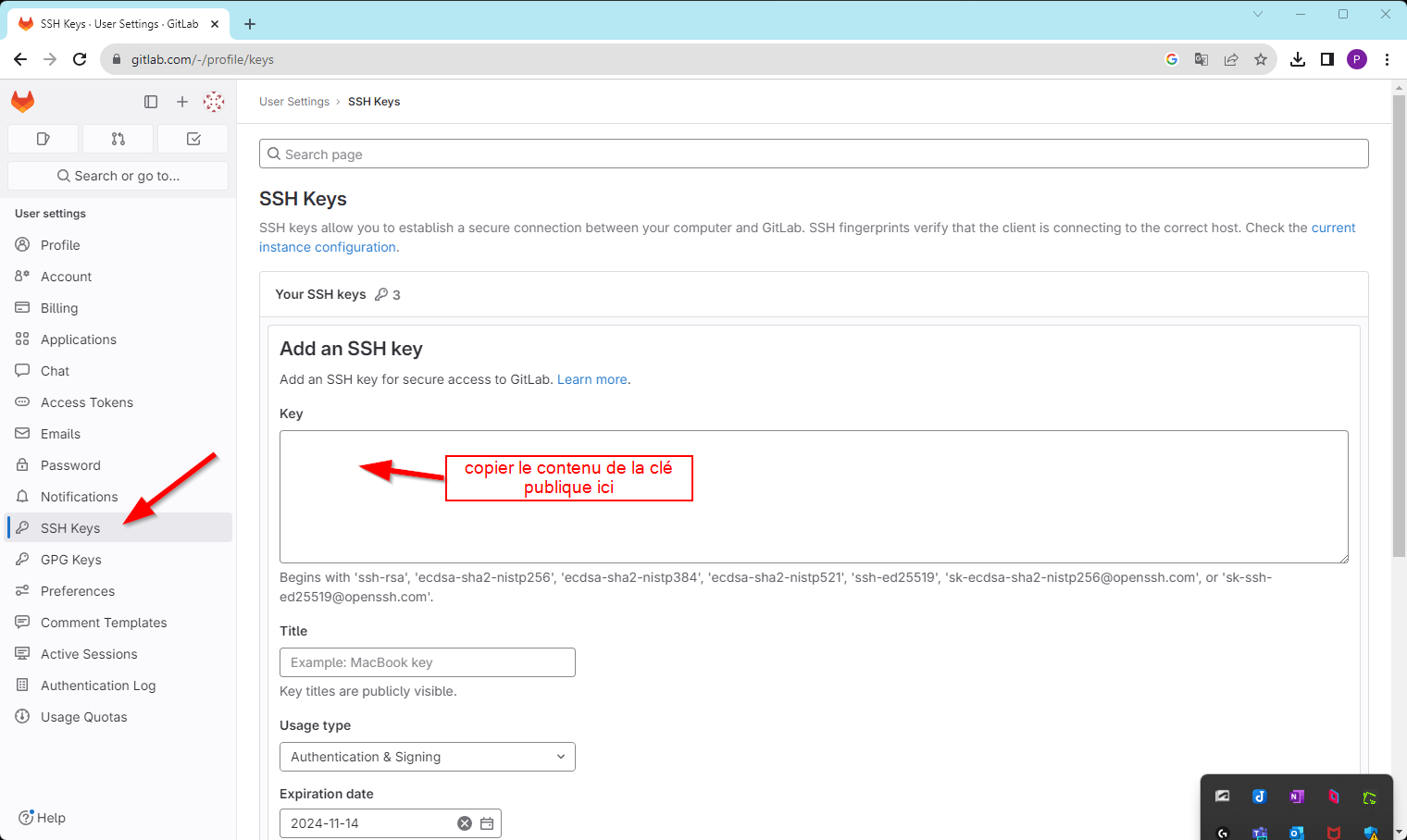 Aller dans SSH Keys sur le panneau latéral et ajouter une nouvelle clé.